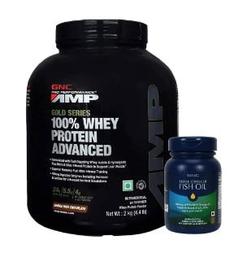 GNC Amp Gold Series 100% Whey Protein Advanced 4.4 lb Double Rich Chocolate + GNC Triple Strength Fish Oil 60 softgels Combo